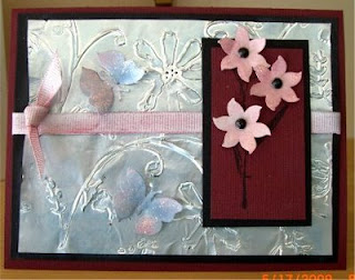 I got this idea from Gina K at Stamp TV, first you color your stamp with markers then thump with co-ordinating colored markers for a neat effect. The background paper is also a freebie I downloaded from Stamp TV, I meant to stamp some 2nd impressions in black but I forgot, guess that means I'll have to do another one......LOL
